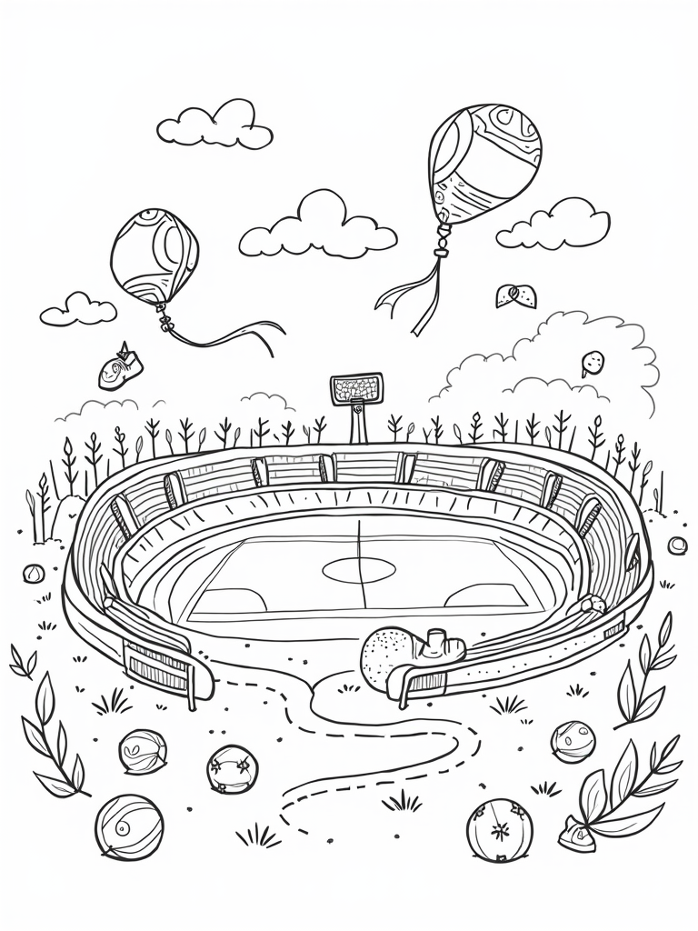 This fun coloring page showcases a sprawling sports arena that's shaped like a giant soccer ball, right in the middle of a bright green meadow. You’ll see oversized tennis rackets leaning against the goalposts, waiting for a game to start. Up above, swirling clouds have magically turned into a basketball hoop, adding a touch of whimsy to the scene!