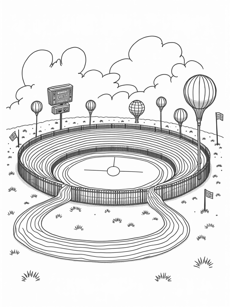 Winding through this lively setting is a track made of curling ribbons, leading your eyes towards a gigantic scoreboard shaped like a whistle. Nearby, golf tees sprout up like flowers, each one proudly displaying a little flag that flutters in the breeze. It’s a delightful mix of sports equipment that invites you to let your imagination run wild while you color!