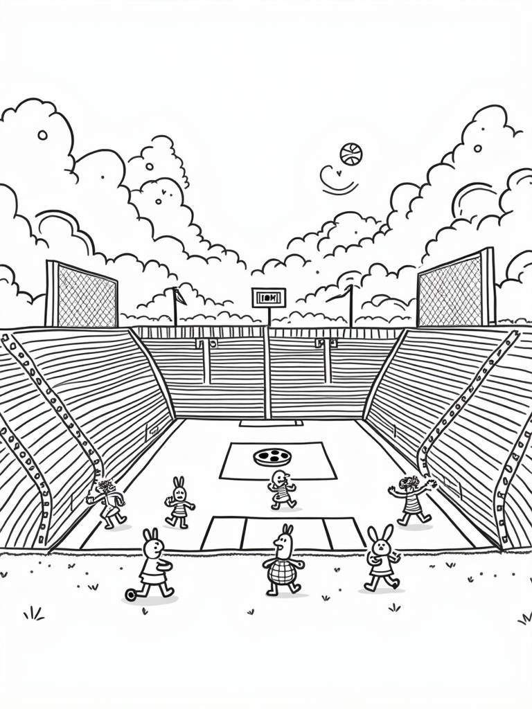 Look up at the swirling clouds—they’re not just any clouds! They’re shaped like tennis rackets and baseball bats, adding an extra layer of fun to this playful event. And if you squint, you might even catch a glimpse of the sun wearing cool sunglasses, beaming down on all the action. It's a vibrant and joyful atmosphere, perfect for some creative coloring!