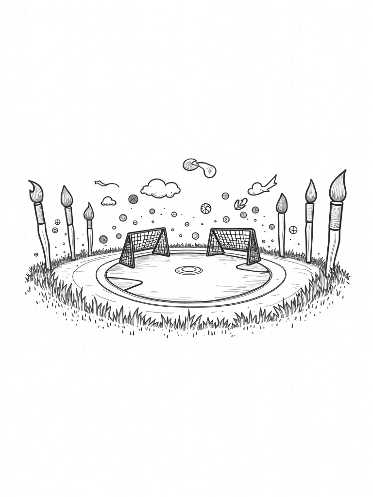This coloring page shows a unique sports arena, designed like a big soccer ball, nestled in a bright green field. The goalposts made from colorful paintbrushes add a splash of creativity, while oversized foam fingers cheer from the sidelines. It's a playful scene that encourages kids to think outside the box when it comes to sports!