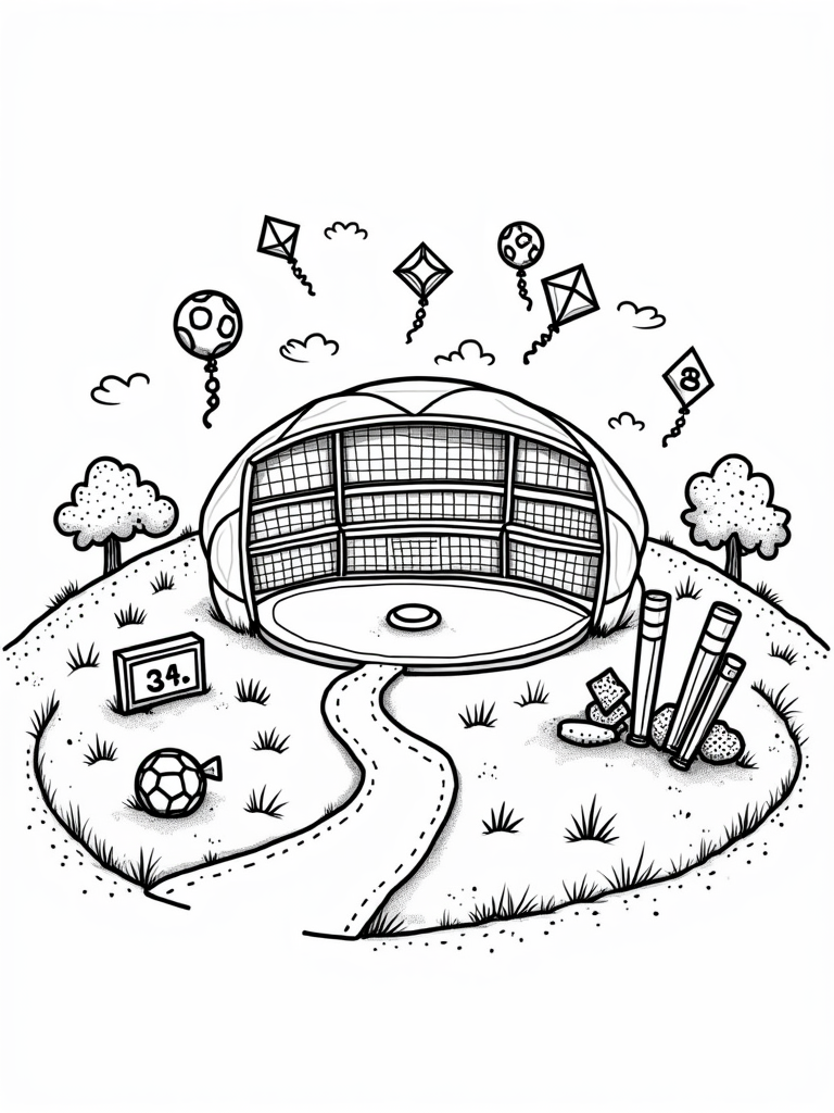 Check out this free, printable coloring page featuring a whimsical sports arena shaped like a giant soccer ball! It's filled with colorful kites, a friendly whistle, and playful bouncy balls—perfect for kids who love sports and coloring.
