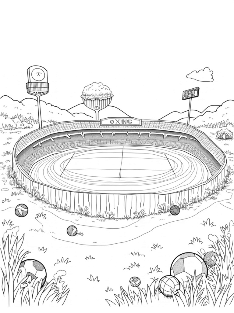 Winding around the arena is a swirling track made of vibrant paint, leading to a scoreboard that’s crafted from colorful paint tubes. It’s not just any scoreboard; it’s bursting with colors that make it look like a piece of art! And don’t forget the collection of sports balls resting on a patch of cheerful daisies in the foreground, each one sporting its own unique abstract design. This scene is packed with creativity just waiting for your favorite colors!