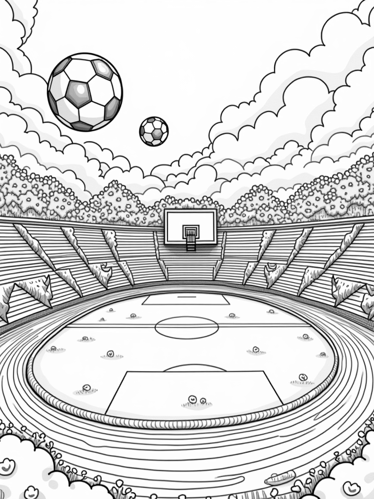 This lively coloring page shows a massive sports arena filled with all sorts of fun! Imagine giant inflatable soccer balls floating above a bright green field. Right in the middle, there's a huge basketball hoop that spirals high into the sky, wrapped with playful vines. It's a sight that'll get any sports fan excited!