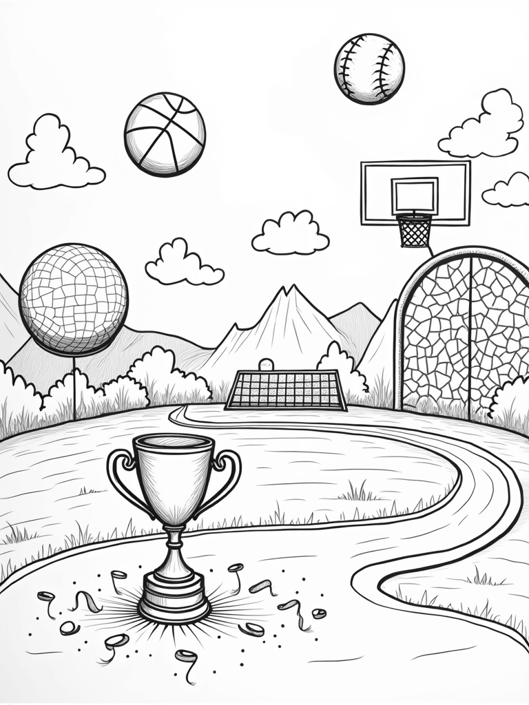 Above the scene, there's a fluffy cloud shaped like a baseball, drifting lazily by. And check out the sparkling trophy in the foreground, surrounded by colorful ribbons and confetti. This page is all about sports and fun, so grab your favorite coloring tools and let your imagination run wild! You can use any colors you like, from bright and bold to soft pastels. It’s all about having a good time!