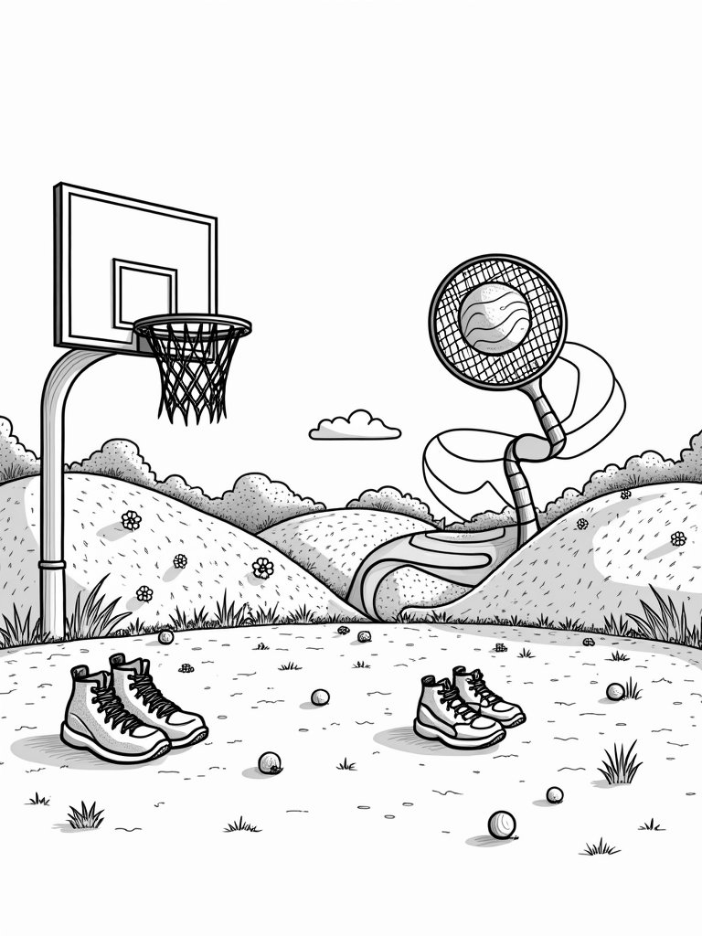 Imagine a sports arena where everything is just a bit larger than life! A colossal basketball hoop towers over a grassy field, its net playfully tangled with colorful ribbons. Nearby, a giant tennis racket leans against a hill, and its strings are decorated with tiny flowers, making it feel like a magical garden. You can even spot a winding track made of vibrant paint splatters that spirals around the scene, leading to a gigantic soccer ball that looks like it’s from another planet!