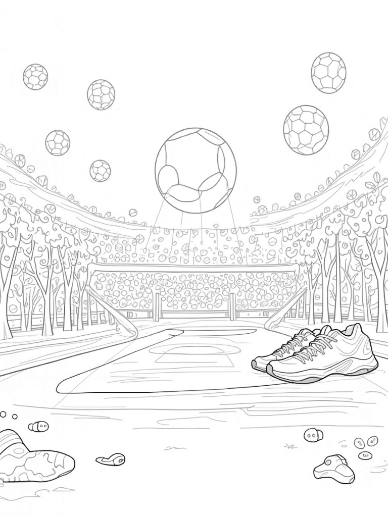This coloring page takes you to a grand stadium filled with oversized sports equipment! Imagine a colossal soccer ball acting as the central dome, towering over everything. In the foreground, giant tennis rackets stand tall like trees, with their strings creating fun patterns above. You can even spot a track made of vibrant running shoes winding around a mountain of colorful foam footballs!