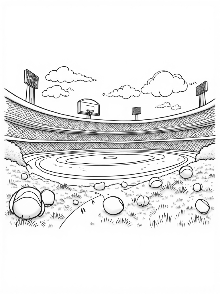 This fun scene is packed with giant sporting gear that’s just waiting for your favorite colors! Right in the middle, there’s a massive basketball hoop towering over a swirling mix of colorful basketballs. Off to the side, a gigantic baseball bat leans against a grassy mound, while oversized baseballs are scattered around like big rocks. It’s like a sports lover's dream come true!