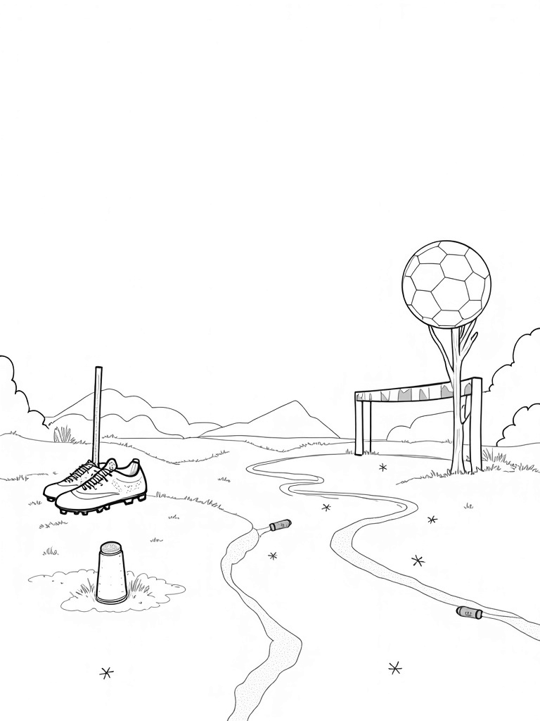 This scene is all about fun! A gigantic soccer ball floats high above a vibrant green field, casting a cool shadow over a winding river that sparkles like stars. Nearby, you’ll spot oversized soccer cleats standing proudly, with one pair's laces cascading down like playful vines into the grass. In the background, there's a towering goal post made from branches, reaching toward the sky and decorated with colorful banners that dance in the breeze.