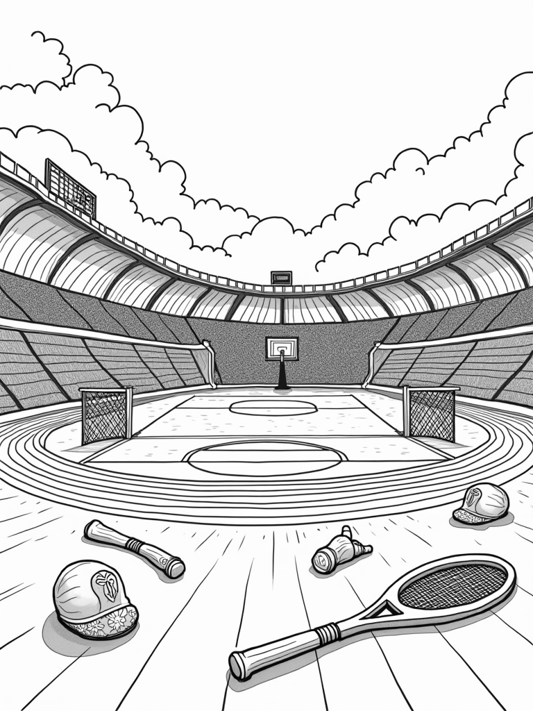 Check out this free, printable coloring page featuring a gigantic soccer ball stadium filled with vibrant sports murals. Perfect for kids who love sports and creativity, this coloring page is ready for some colorful fun!