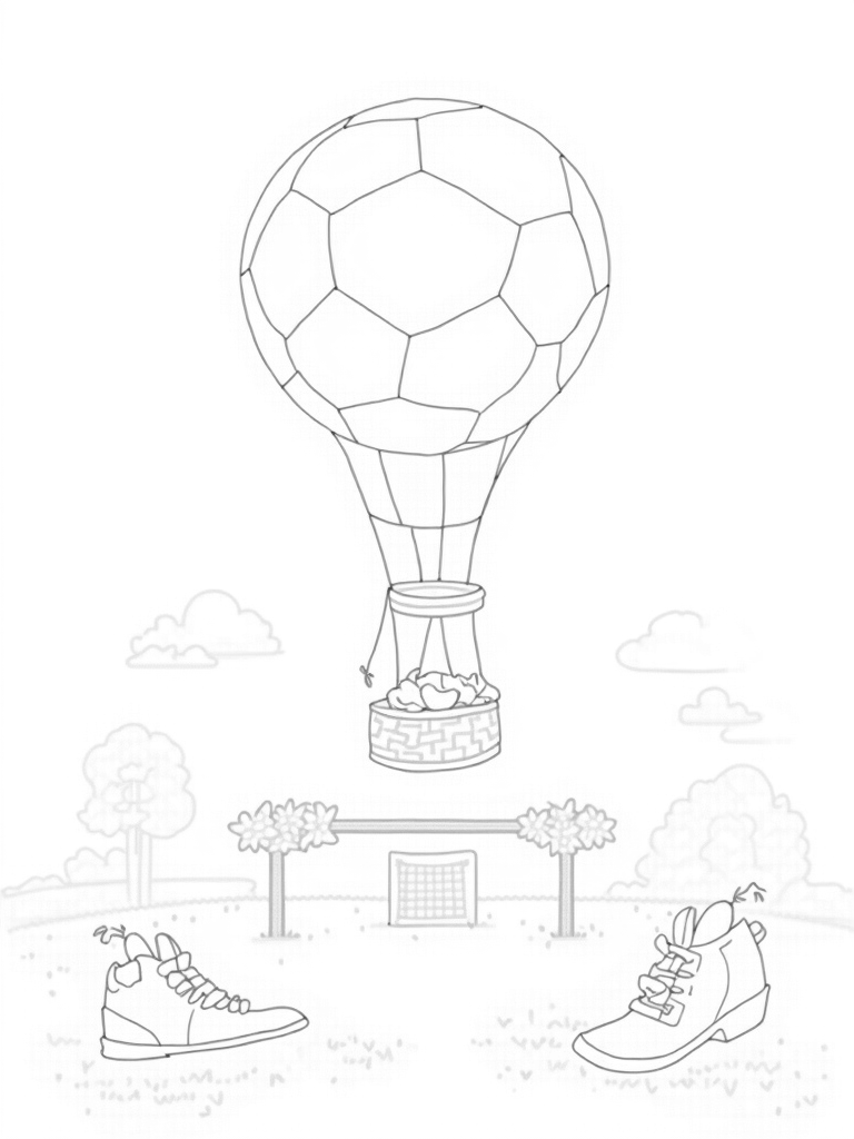 Imagine a gigantic soccer ball floating above a grassy field, transformed into a bright and colorful hot air balloon! Underneath, a goalpost made of twisting vines arches gracefully, decked out with vibrant ribbons swaying in the breeze. It's a scene that combines sports with a splash of whimsy, perfect for little artists.
