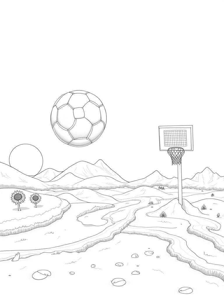 You’ll find a gigantic inflatable soccer ball floating above a lively landscape filled with colorful grass. Beneath it, a winding track wraps around a huge tennis racket that stands tall like a tree. Nearby, a massive basketball hoop rises from a patch of cheerful sunflowers, with a net made of cascading vines. In the background, mountains shaped like trophies sparkle under a bright sun, and a peaceful lake reflects the whole scene, with lily pads shaped like footballs bobbing gently on the water.