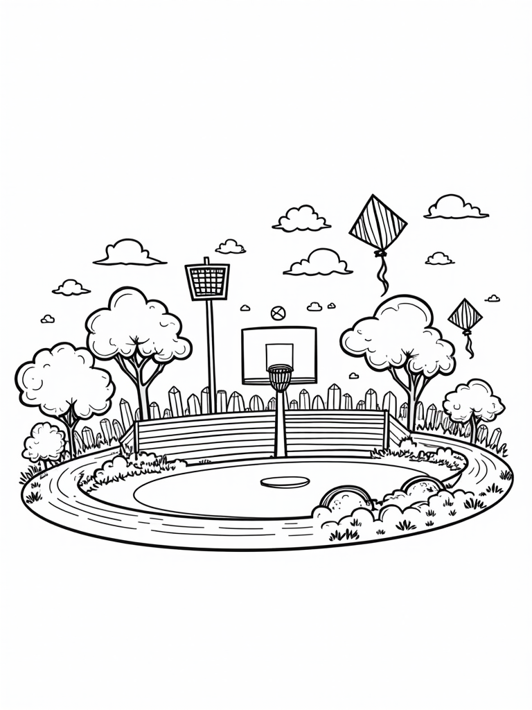 Nearby, a whimsical baseball bat leans against a tree, but it’s not just for hitting home runs! Its handle twists and turns into a playful slide, perfect for little ones to zoom down. In the sky, colorful kites shaped like different sports balls dance among the clouds, adding an extra splash of fun. Plus, there’s a winding track that spirals around the scene, dotted with cheerful flowers and playful obstacles for kids to navigate.