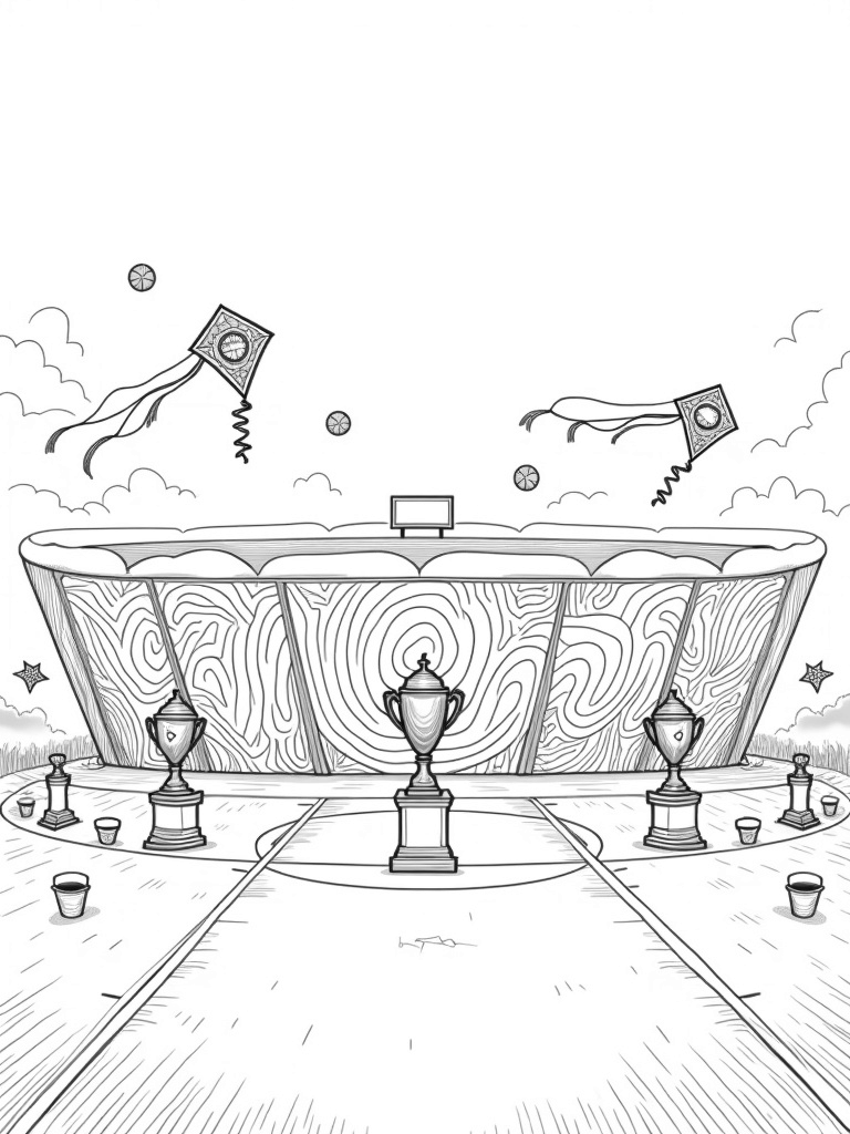 Can you imagine a stadium that looks just like a giant soccer ball? This coloring page shows a sprawling arena with fun, swirling patterns on its panels. On the field, there are some oversized trophies that are sure to catch your eye. Each trophy has its own unique design, representing different sports, which makes it even more exciting to color!