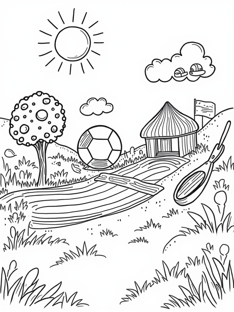 Don't miss the vibrant, rainbow-colored track winding its way around a cheerful finish line banner. It's perfect for racing your friends to see who can color the fastest! Look up to find fluffy clouds wearing tiny football helmets, adding a whimsical touch to the sky. In one corner, a gigantic tennis racket leans against a hill, and oversized tennis balls are rolling down, just waiting for your crayons to bring them to life!