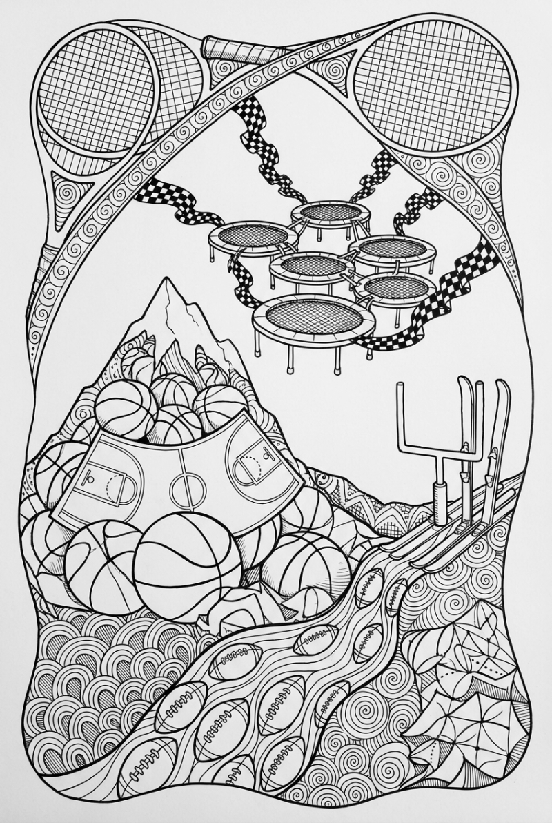 Since the line art is all clean sections, you can experiment with bold colors for the equipment and softer shades for the background sky. Try using a bright orange for the basketball mountain, classic black and white stripes for the footballs, and maybe a pop of red on the racing flag ribbons. Let your imagination run wild!