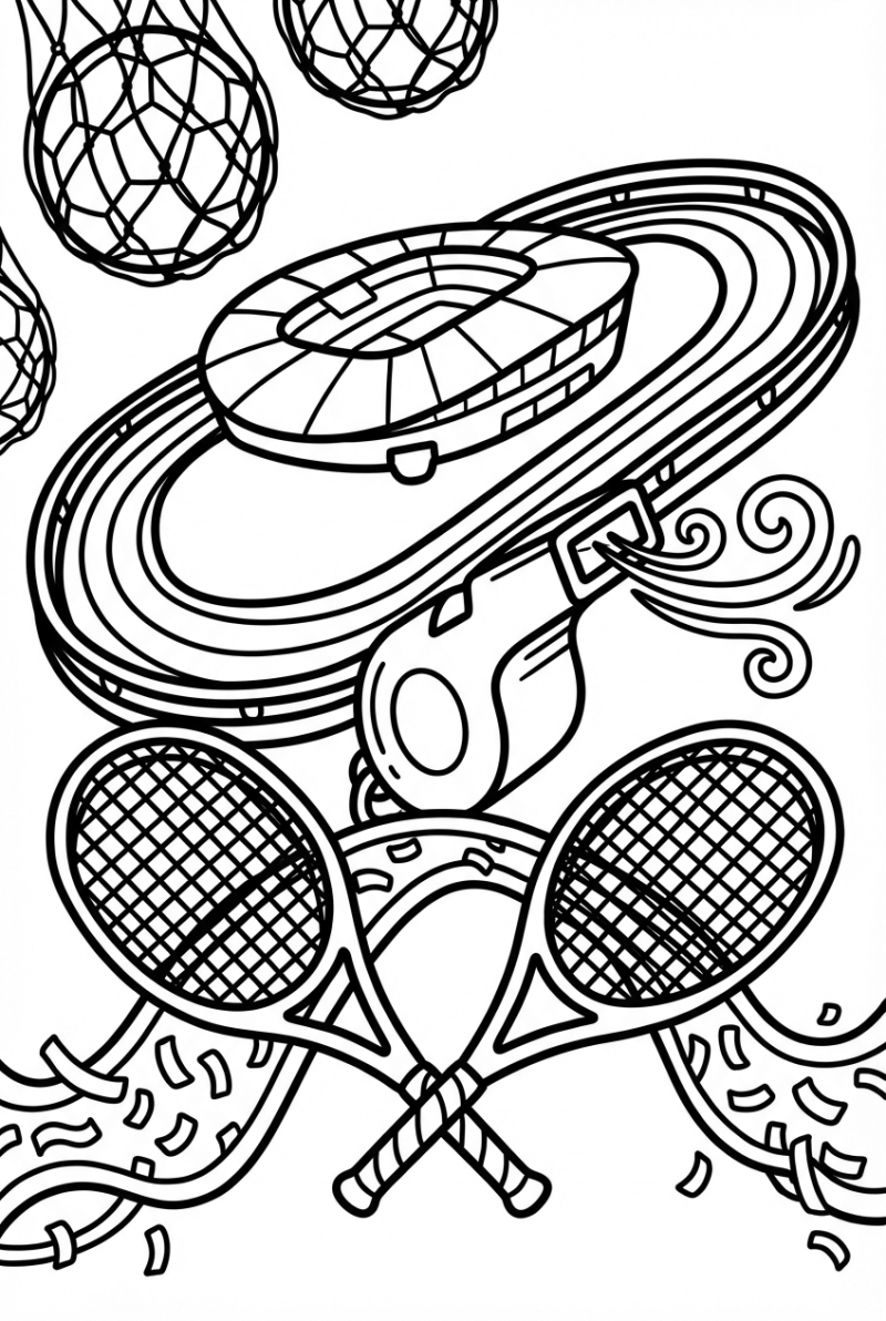 Look at this crazy scene: a giant treadmill loop hugs the edge of a floating stadium roof, and up above you see huge soccer‑ball moons with faint nets around them. Two massive tennis racquets stretch across the track, acting like a bridge over a ribbon‑like flood of confetti. Right in the middle, a towering whistle sprouts, its mouthpiece blowing out swirling breezes. All the lines are bold and smooth, so it’s easy for little hands to fill in.
