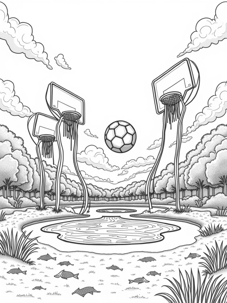 Check out this free, printable coloring page featuring a surreal sports arena with a floating soccer ball, oversized tennis racquets, and whimsical fish. Perfect for kids who love sports and creativity!