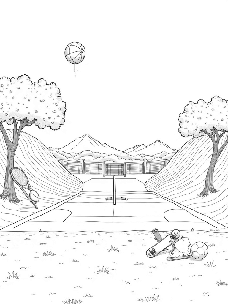 This coloring page showcases a wild sports arena that's anything but ordinary! Right in the center, there’s a gigantic basketball floating above a spiral court made of grassy hills. It’s like a dream where sports gear comes to life! To the side, you’ll spot a massive tennis racket leaning against a tree, its strings all tangled up with vines, making it look even more whimsical.