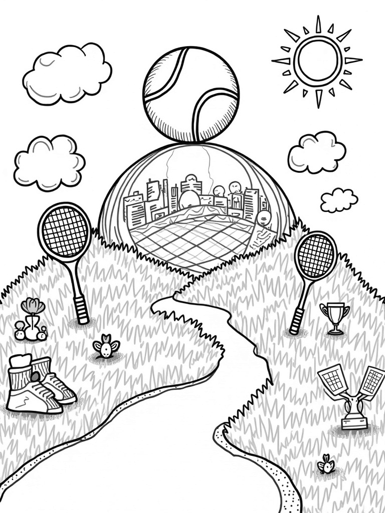 Imagine a giant tennis ball sitting proudly on a grassy hill, ready to surprise you! As it splits open, a vibrant landscape unfolds, filled with swirling clouds that look just like tennis court lines. It’s a magical scene where sports meet imagination!