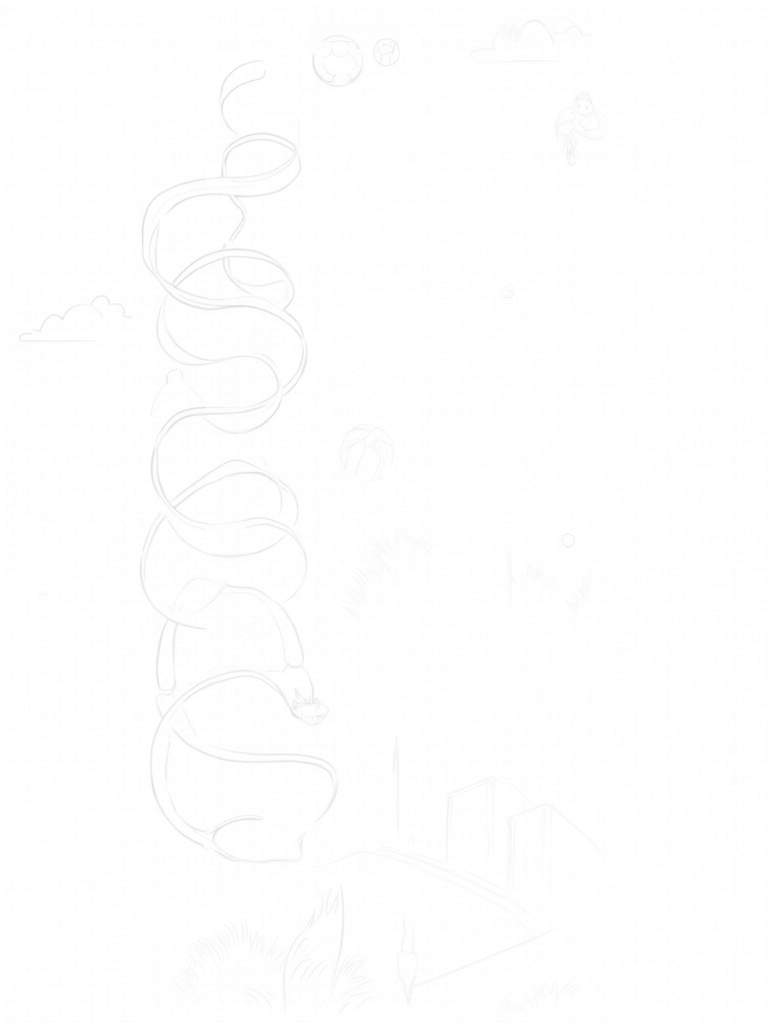 This coloring page showcases a giant, twisting basketball hoop that spirals high into the sky, decorated with bright, colorful ribbons. Below it, a wave of soccer balls rolls across a grassy field, creating a fun and playful scene. Nearby, there's a tennis court floating in the air, with oversized tennis rackets propped against fluffy clouds, adding to the whimsical feel.