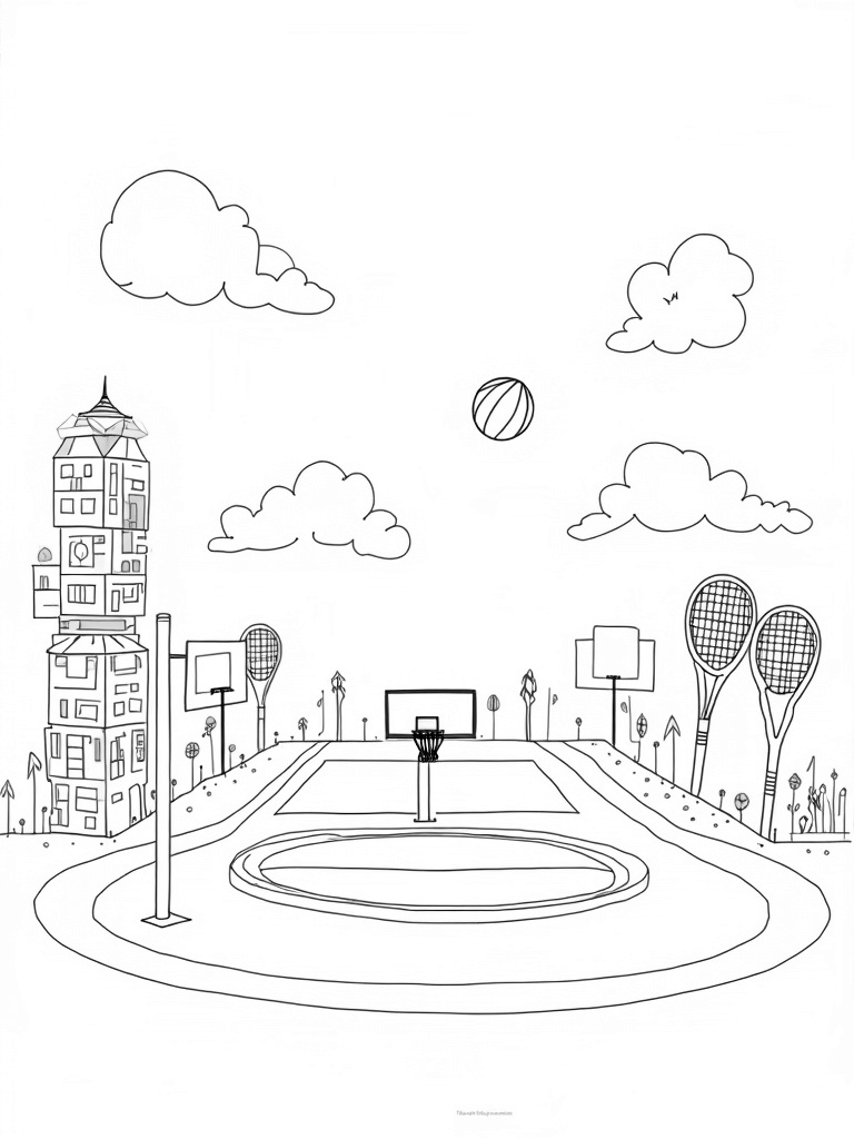 On the other side, you’ll spot some oversized tennis rackets propped against a grassy hill, each one showcasing cool geometric designs. And don’t miss the fluffy clouds drifting overhead, shaped like different sports balls! It’s a super fun mix of sports and creativity that’s sure to inspire some colorful masterpieces.