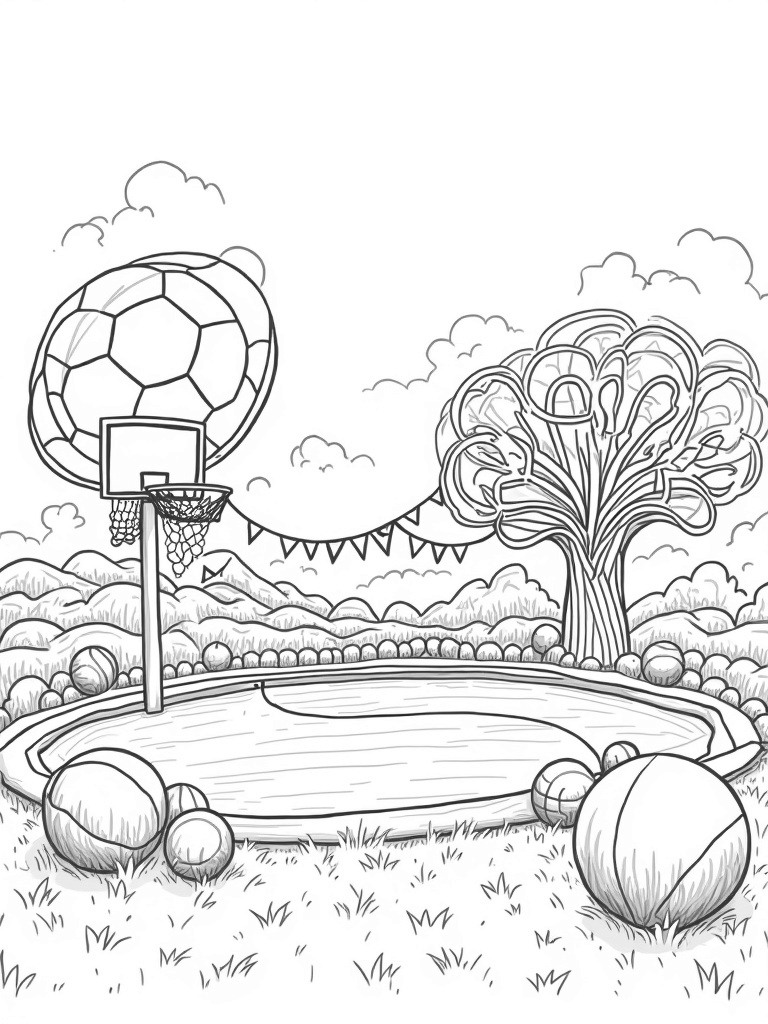 As you color, notice the oversized footballs and baseballs scattered around, creating a lively border. And look up! There’s a giant whistle hanging from a tree made of gymnastic rings, casting cool shadows on the ground below. It’s all about sports here, but with a touch of whimsy that makes it perfect for kids.