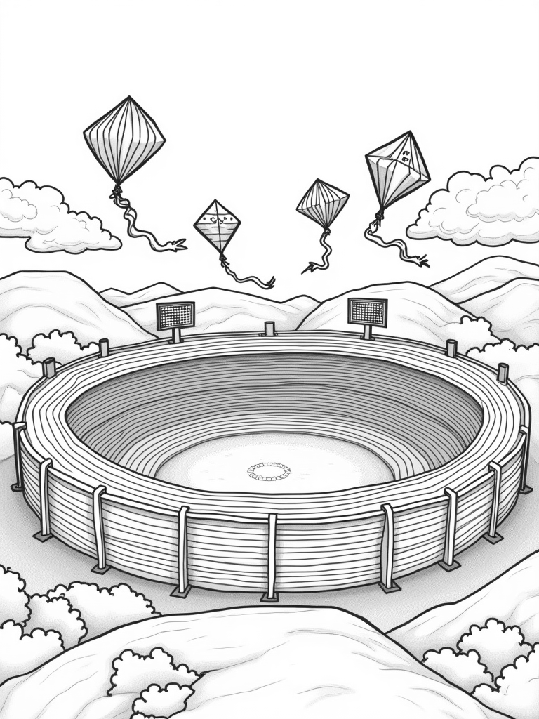 Don’t forget to look up! The sky is filled with colorful kites shaped like different sports gear, drifting lazily among fluffy clouds. The trailing ribbons make it look even more festive. It’s a perfect day for a sports-themed coloring session!
