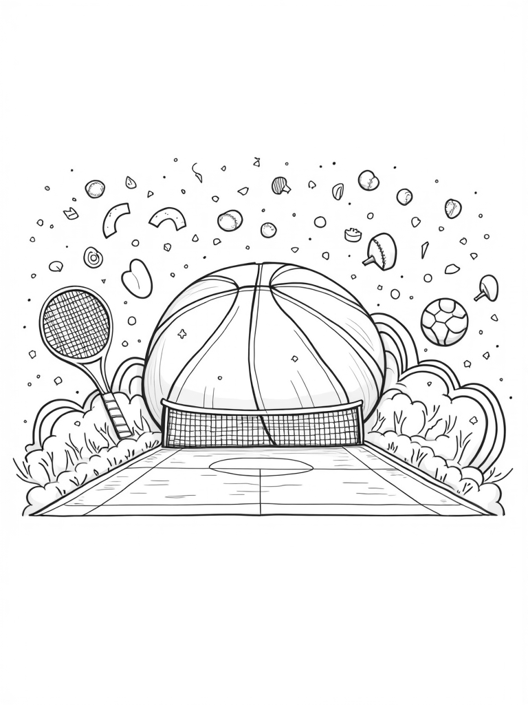 This coloring page showcases a fantastical sports arena built from oversized sports gear. At the heart of it all is a giant basketball serving as the dome, radiating energy with swirling lines that suggest motion. To one side, a massive tennis racket arches gracefully, transforming its strings into a colorful net that catches floating, abstract tennis balls. On the opposite side, an enormous soccer ball sits like a boulder, surrounded by patches of spiraling grass, creating an inviting atmosphere for all young athletes.