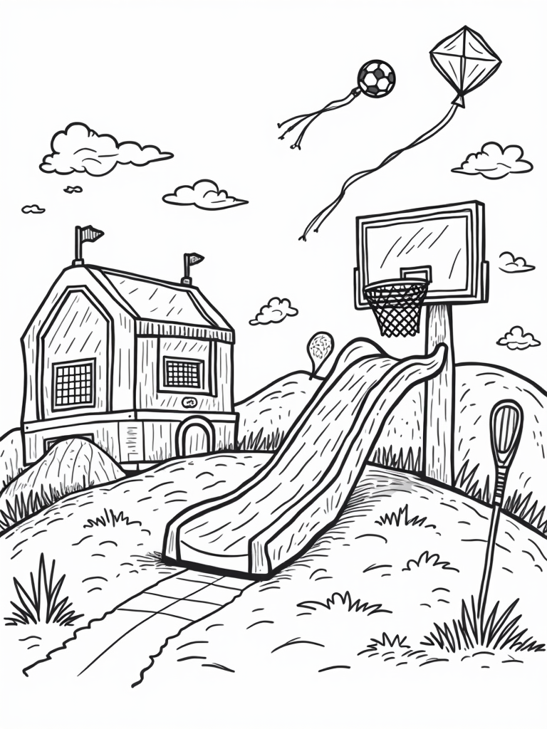 As you color, don’t miss the giant baseball bat leaning against a soft green hill, perfect for some imaginative play. And above it all, colorful kites shaped like different sports gear dance in the wind. Each element in this playground is designed to ignite your imagination and bring joy to your coloring experience!