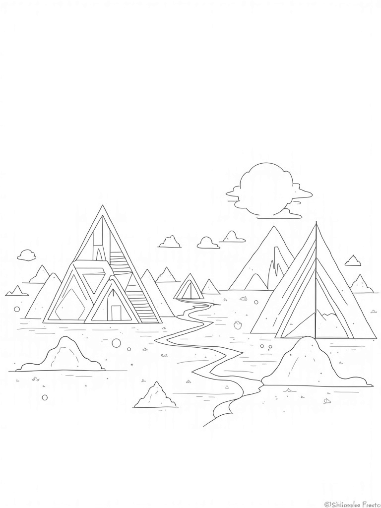 Scattered throughout the scene are smaller triangle-shaped clouds, adding a playful touch to the sky. Below, a river of zigzagging triangles flows gently, mirroring the bright colors above. It’s a whimsical mix of shapes that invites creativity. Kids can use their favorite colors to bring this unique landscape to life!
