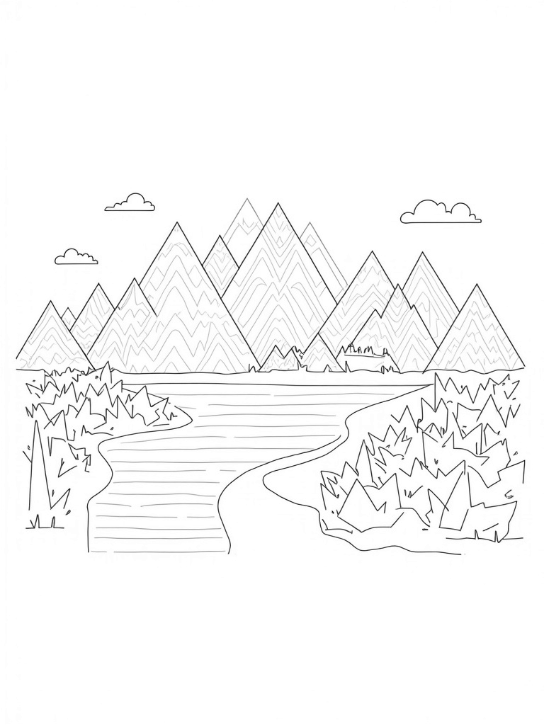 Colorful Triangle Mountains and a Tranquil Pond Coloring Page