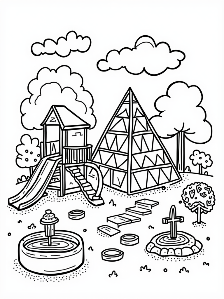 Check out this free, printable coloring page featuring a vibrant triangle playground! With a pyramid slide, triangular swings, and a sandbox filled with geometric toys, it’s perfect for little artists who love to color outside the lines.