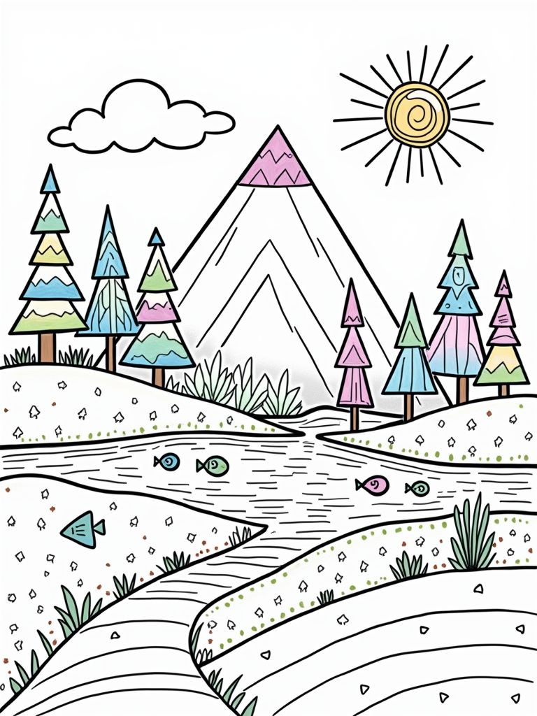Colorful Triangular Landscape with Trees and a Pond Coloring Page