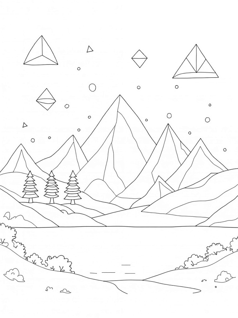 Check out this amazing landscape filled with all sorts of triangles! Some are bold and colorful, while others are just outlines waiting for your creativity. Right beneath them, a big, smooth triangle acts like a calm lake, perfectly reflecting the shapes above. It’s like a hidden world where everything is made of triangles!
