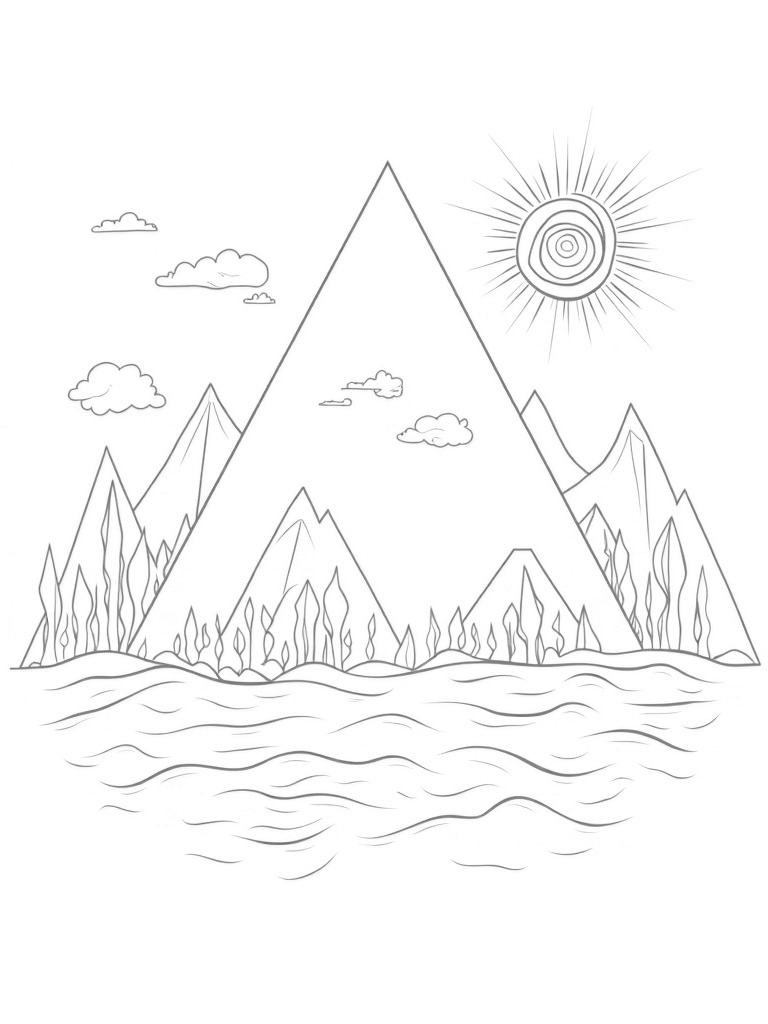 The sun, made up of concentric triangles, shines down with its angular beams, adding warmth to the scene. It’s a fun way to explore shapes and colors while using your imagination to bring this landscape to life. Grab your favorite coloring tools and let those triangles shine!