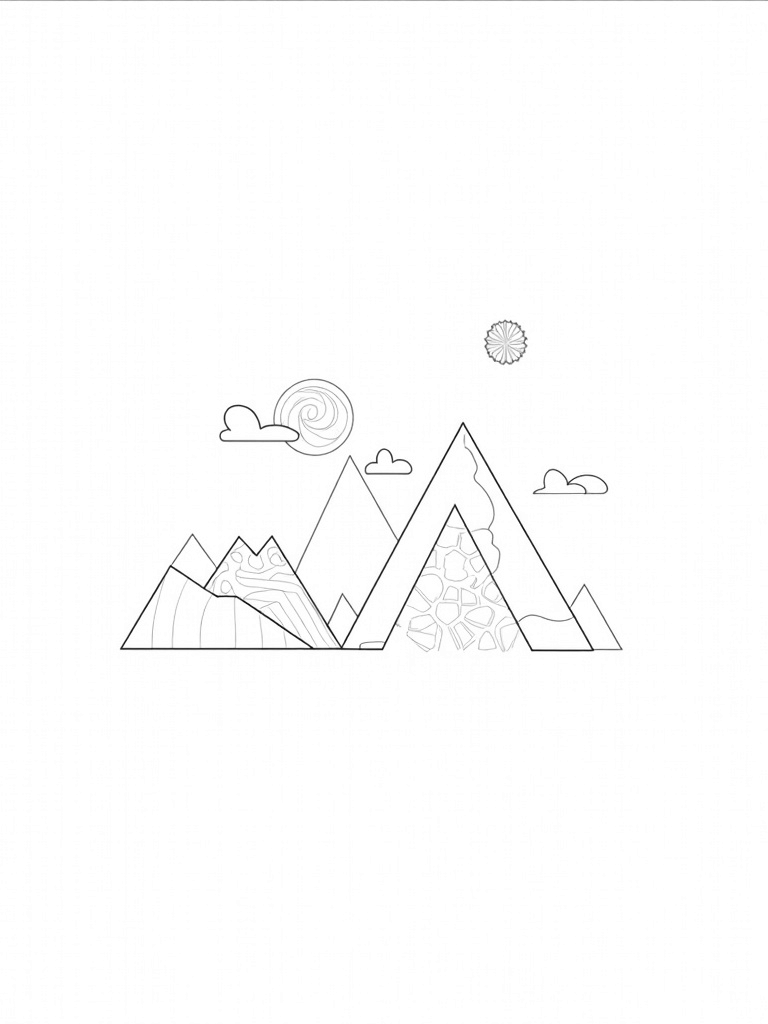 In the background, a series of triadic mountains rise majestically into the clouds, their surfaces beautifully decorated with spiral designs. Above it all, a radiant sun made up of interlocking triangles beams down, spreading light and creating a lovely mosaic effect on the ground below. It’s a perfect mix of shapes and patterns that’ll keep you entertained for hours!