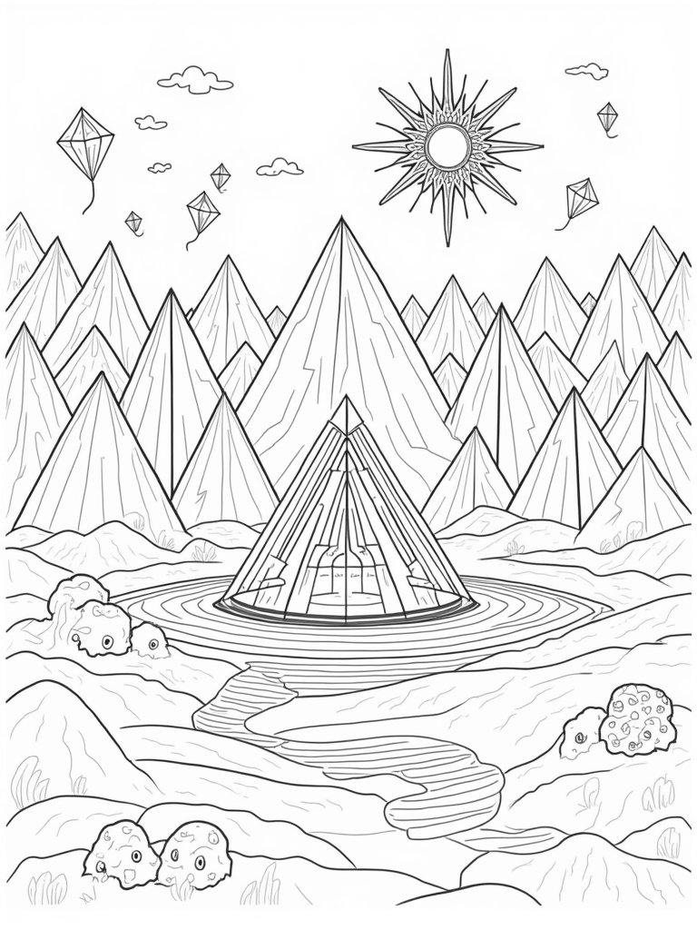 Grab your favorite coloring tools and let your imagination run wild! The winding path made of smaller triangles leads you to a bright sun with radiating triangular rays, filling the whole landscape with warmth. You can choose any colors you like for the mountains, the fountain, and those awesome kites. It’s a great way to get creative while exploring shapes!