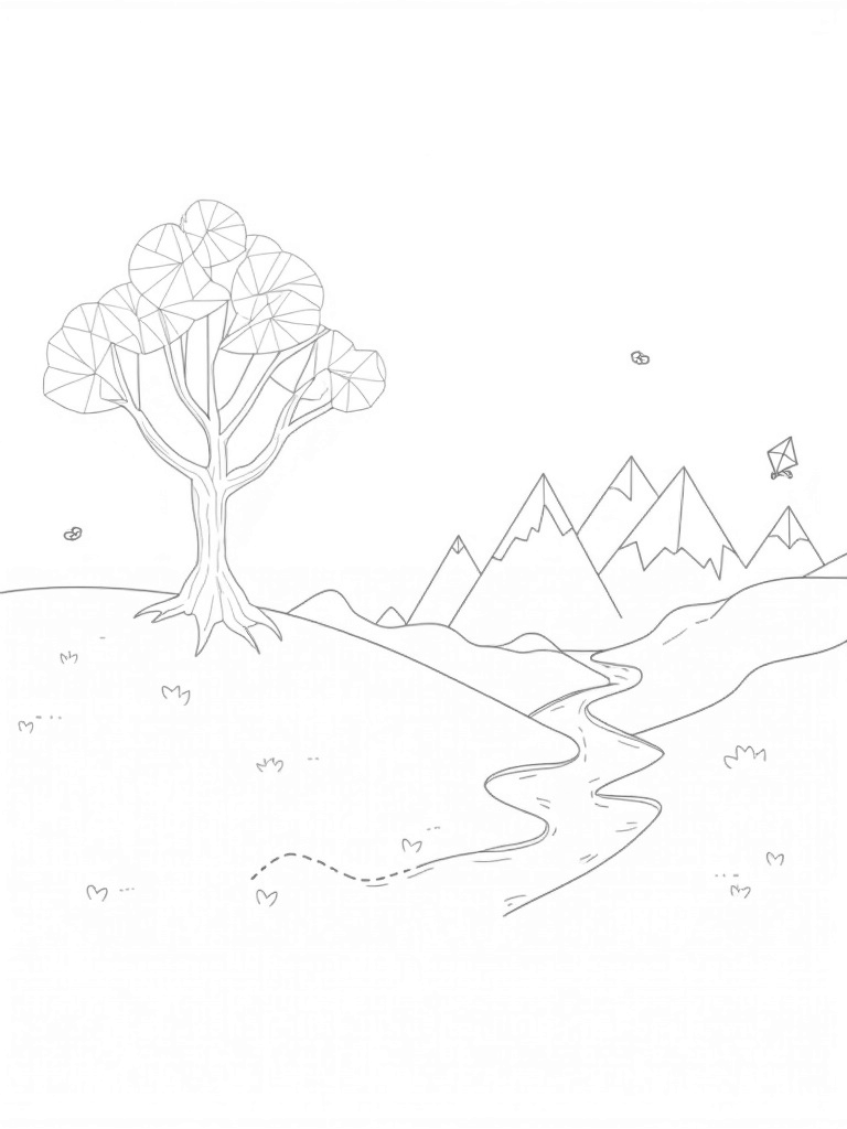 Geometric Landscape with Triangular Tree and Kites Coloring Page