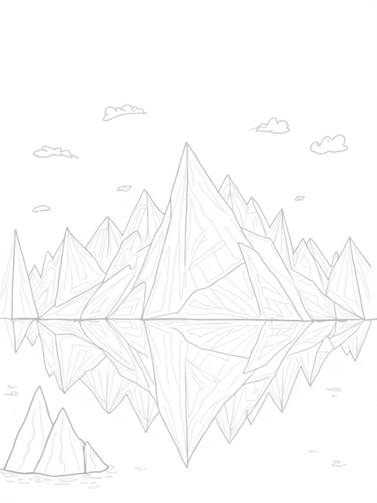 Imagine a world where mountains are made entirely of overlapping triangles! Each peak is a different size, creating a cool and interesting skyline. In the foreground, a peaceful lake mirrors these sharp angles, making the water shimmer with all the shapes above. It's like nature's own puzzle waiting for you to add your colors!