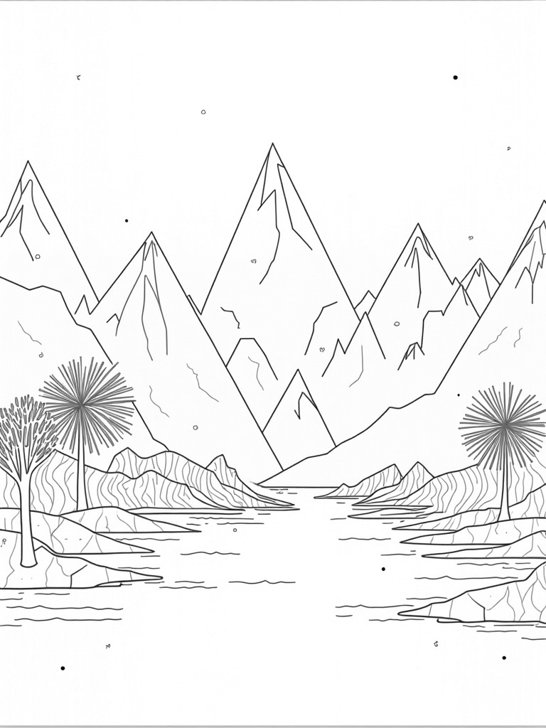 This scene is all about triangles! You’ll see giant, overlapping triangles creating a stunning landscape. Some are filled with intricate patterns just waiting for your favorite colors, while others are outlined and ready for you to bring them to life. In the background, there are towering triangular mountains that seem to touch the sky, and in the foreground, a tranquil lake reflects the beauty around it.