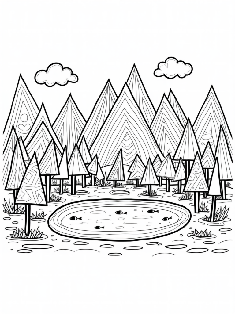 Check out this free, printable coloring page featuring a vibrant geometric landscape filled with triangles! With mountains, trees, and a pond, it's a fun way for kids to explore their creativity.