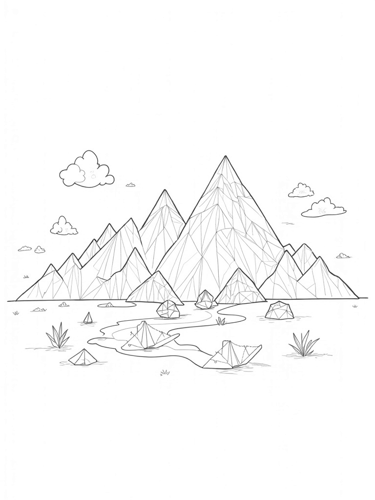This coloring page showcases a stunning landscape filled with interlocking triangles that create a magnificent mountain range. Each peak is uniquely decorated with intricate patterns, making it a fun challenge for little artists. In the foreground, a large, three-dimensional triangle serves as a prism, casting a beautiful array of colorful light rays onto the ground. Look closely, and you’ll spot smaller triangles floating in the air and some that look like stepping stones leading to a delightful origami garden.