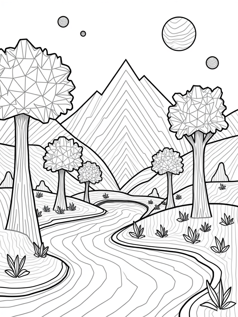 Picture a world where trees have gigantic, triangular canopies that are bursting with fun patterns! Underneath these oversized trees flows a winding river made of colorful triangles, shimmering like a patchwork of vibrant colors. As you color, imagine the suns and moons in the sky, all made from sharp angles, reflecting down on the river.