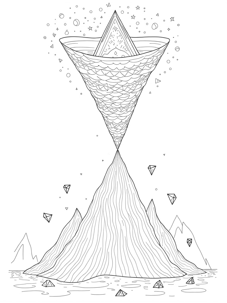 Check out this amazing scene filled with swirling triangles! Each triangle is unique in size and pattern, with some sporting intricate designs while others flaunt bold geometric shapes. Down below, a giant triangle towers like a mountain, its sides decorated with textures that look like scales. Floating around the base are triangular prisms that catch the light and create a dazzling display of colors. Look up and you'll see overlapping triangular clouds that add a dynamic touch to the sky above!