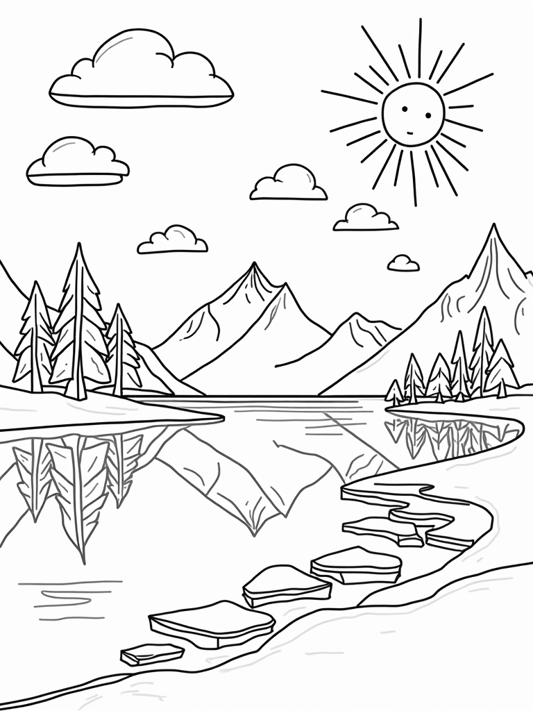 Check out this free, printable coloring page featuring a tranquil lake, colorful triangles, and geometric trees. Perfect for kids who love shapes and creativity!
