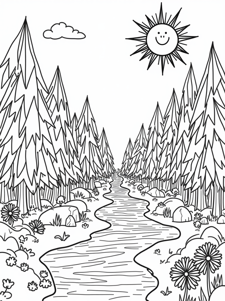 Check out this free, printable coloring page featuring a whimsical triangle forest. With colorful trees, a playful stream, and a smiling sun, it's perfect for kids who love triangles! Let your imagination run wild as you fill this page with your favorite colors.