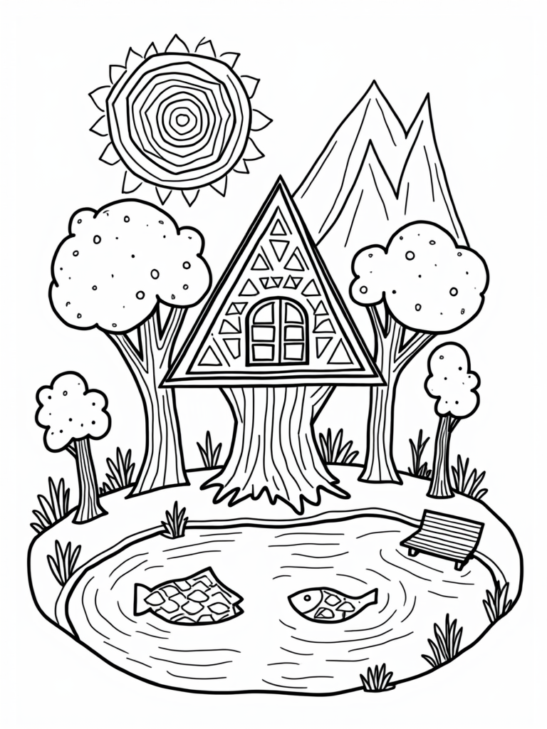Triangle Treehouse Surrounded by Geometric Trees Coloring Page