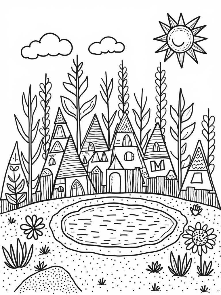 Triangle Village with Colorful Houses and a Sparkling Pond Coloring Page