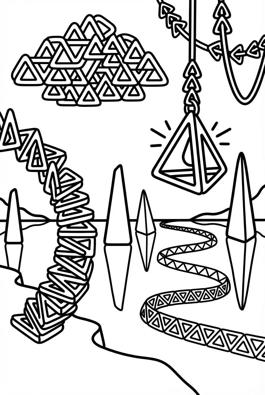 Take a look at this cool scene: a calm, mirrored lagoon scattered with tall, pointy monoliths that look like giant pyramids. From the water’s edge a spiraling staircase made of interlocking triangles climbs up, and hanging above it is a crystal triangle lantern glowing from a thin web of triangle strings. A ribbon of skinny triangles winds across the surface like a gentle current, while the sky above is filled with fluffy, tessellated triangle clouds drifting lazily.