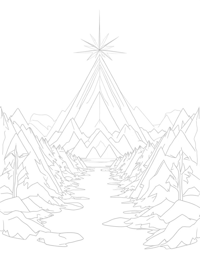 This scene is all about triangles! You’ll see a mix of giant, overlapping triangles in various sizes, creating a unique landscape. Some triangles are filled with cool patterns, while others are ready for your own artistic flair. In the background, there’s a majestic triangular mountain with a shiny prism at its peak, reflecting colorful rays of light.